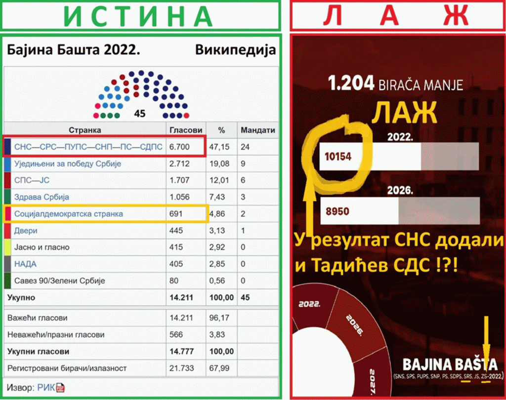 Bajina Bašta. Sledeća velika obmana blokadera FTN i NovaS se odnosi na Bajinu Baštu. Blokaderi FTN i NovaS su rezultatu koalicije „SNS, SRS, PUPS, SNP, PS, SDPS“ 2022. u Bajinoj Bašti 2022., prevarantski dodali rezultat nesumnjivo opozicione liste u Boru – liste „Socijaldemokratska stranka“ Borisa Tadića, koja je dobila 691 glas 2022. godine, i dodali su takođe prevarantski rezultat nesumnjivo opozicione liste u Boru – liste „Zdrava Srbija“ (1056 glasova), koja je te 2022. bila žestoko i dokazano opoziciona stranka. To su bili glasovi protiv SNS. Drastična je obmana javnosti, te glasove dodati rezultatu SNS iz 2022. Tu se ne radi čak ni o sabiranju baba i žaba. Tu se radi o namernoj prevari od strane blokadera FTN, da bi pokušali da dokažu svoje laži. Pali su na ispitu. U Bajinoj Bašti SNS 2026. godine, ima 53,49 %, a blokaderi i opozicija 41,35%.