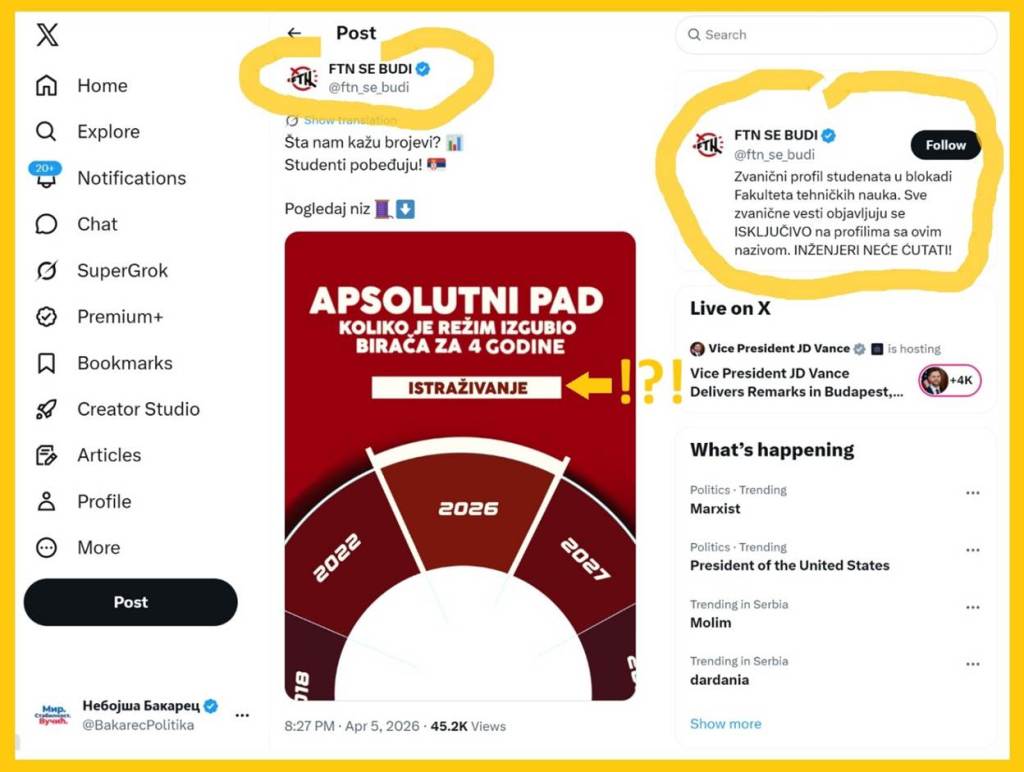 Prvo načelne primedbe. Blokaderi sabiraju babe i žabe, da bi dokazali nedokazivo, da bi dokazali svoju laž da je SNS 2026. dobio drastično manje glasova nego 2022. Istina je da je SNS dobio više 2026. i kada se posmatraju procenti, i glasovi, i mandati, i to na većoj izlaznosti 2026. SNS i partneri su na lokalnim izborima u 10 mesta 29.3.2026. godine osvojili prosečno 56%. Blokaderi su prosečno u 10 mesta dobili 37%. Razlika u korist SNS i partnera iznosi 19%, gotovo 20%. Blokaderi i opozicija su izgubili sa 10:0 na izborima u 10 mesta. To su ubitačne činjenice. Rezultati lokalnih izbora 2022. i 2026. se teško mogu porediti. Politička situacija je drugačija. Akteri su različiti. Takođe, status pojedinih učesnika izbora 2022. i 2026. se drastično razlikuje. Na primer – Zavetnici i Zdrava Srbije su 2022. bili žestoke opozicione stranke, koje su nemilosrdno napadale Vučića i SNS. Zavetnike i Zdravu Srbiju je ostatak opozicije priznavao kao opoziciju. Stoga je potpuno činjenično pogrešno kada blokaderi FTN, rezultat Zavetnika i Zdrave Srbije, tada opozicije, iz 2022. godine, dodaju rezultatu SNS iz 2022. Zapanjujuće pogrešno. Logička greška. Sabiranje baba i žaba. Isto važi i za grešku blokadera FTN, koji rezultatu SNS iz 2022., svuda dodaju glasove SRS iz 2022. SRS je opoziciona stranka. Drugo, potpuno je metodološki pogrešno rezultatu SNS iz 2022. dodati i rezultat SPS i JS. SNS i SPS-JS su tada 2022. godine, na lokalne izbore išli odvojeno. SPS-JS su želeli da profitiraju na faktoru „početak rata u Ukrajini“ u čemu su uspeli i na lokalu i na parlamentarnim izborima. Na sledećim izborima 2023. i 2024. taj profit je nestao. Činjenica je da nije oslabio SNS, oslabili su SPS i JS. SNS je ojačao. Potpuno je pogrešno rezultatu SNS iz 2022. dodavati rezultat SPS-JS. Tome pridodajte informaciju koju je saopštio predsednik Vučić uveče 29.3.2026., koji je izjavio da najnovije omnibus istraživanje pokazuje da SNS trenutno ima najbolji rejting u poslednjih 5 godina. Podsećam na rezultate izbora 29.3.2026. godine. Fantastičan je rezultat SNS u svih 10 lokalnih samouprava gde su održani izbori. U Aranđelovcu SNS 52,96%, blokaderi 44%. U Bajinoj Bašti SNS 53,49 %, blokaderi 41,35%. U Boru SNS 49,22 %, blokaderi 42%. U Kladovu SNS 72 %, blokaderi 26,69%. U Knjaževcu SNS 57,11 %, blokaderi 32,9%, opozicija 8,9%. U Kuli SNS 50,52%, blokaderi 48%. U Lučanima SNS 63,78 %, blokaderi 30%. U Majdanpeku SNS 65,64%, blokaderi 19%, opozicija 13%, U Sevojnu SNS 51,5, blokaderi 44,8% i u Smederevskoj Palanci SNS 58%, blokaderi 29,22, opozicija 9,5%. Kada se pogleda lažno istraživanje, tj. primitivna i namerno pogrešna računica studenata blokadera FTN prikazana u tekstu i na „X“ profilu blokadera FTN vidimo sledeće. Objasniću stavku po stavku.