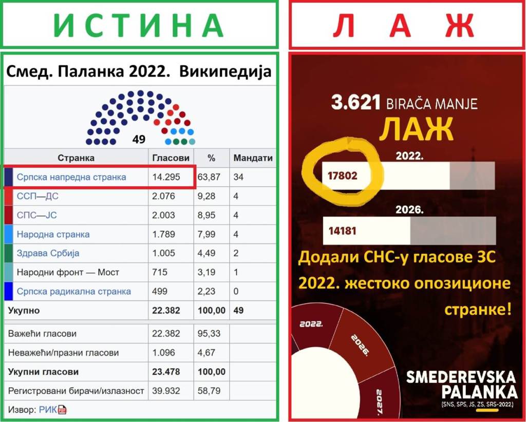 Smederevska Palanka. Sledeća velika obmana blokadera FTN i NovaS se odnosi na Smederevsku Palanku. Blokaderi FTN i NovaS su rezultatu SNS 2022. u Smederevskoj palanci, prevarantski dodali rezultat nesumnjivo opozicione liste Zdrave Srbije. Opoziciona Zdrava Srbija je u Smederevskoj Palanci 2022. dobila 1005. glasova. To su bili glasovi protiv SNS. Drastična je obmana javnosti, te glasove dodati rezultatu SNS iz 2022. Tu se ne radi čak ni o sabiranju baba i žaba. Tu se radi o namernoj prevari od strane blokadera FTN, da bi pokušali da dokažu svoje laži. Pali su na ispitu. U Smederevskoj Palanci SNS 2026. godine, ima 58%, a blokaderi 29% i opozicija 9,5%.