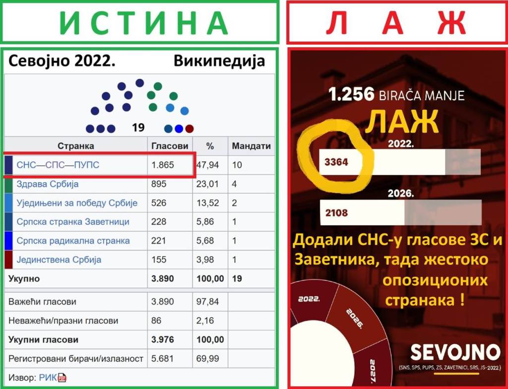 Sevojno. Još jedna velika obmana blokadera FTN i NovaS se odnosi na Sevojno. Blokaderi FTN i NovaS su rezultatu SNS-SPS-PUPS (1865 glasova), 2022. u Sevojnu, prevarantski dodali rezultate nesumnjivo opozicionih lista Zavetnika i Zdrave Srbije. Opoziciona Zdrava Srbija je u Sevojnu 2022. dobla 23 odsto, a Zavetnici gootovo 6 odsto glasova. To su bili glasovi protiv SNS. Drastična je obmana javnosti, te glasove dodati rezultatu SNS iz 2022. Blokaderi su slagali da je SNS imala 3364 glasa u Sevojnu 2022., a istina je da je koalicija SNS-SPS-PUPS ima 1865 glasova. Tu se ne radi čak ni o sabiranju baba i žaba. Tu se radi o namernoj prevari od strane blokadera FTN, da bi pokušali da dokažu svoje laži. Pali su na ispitu. U Sevojnu SNS 2026. godine, ima 51,5%, a blokaderi i opozicija 44,8%.