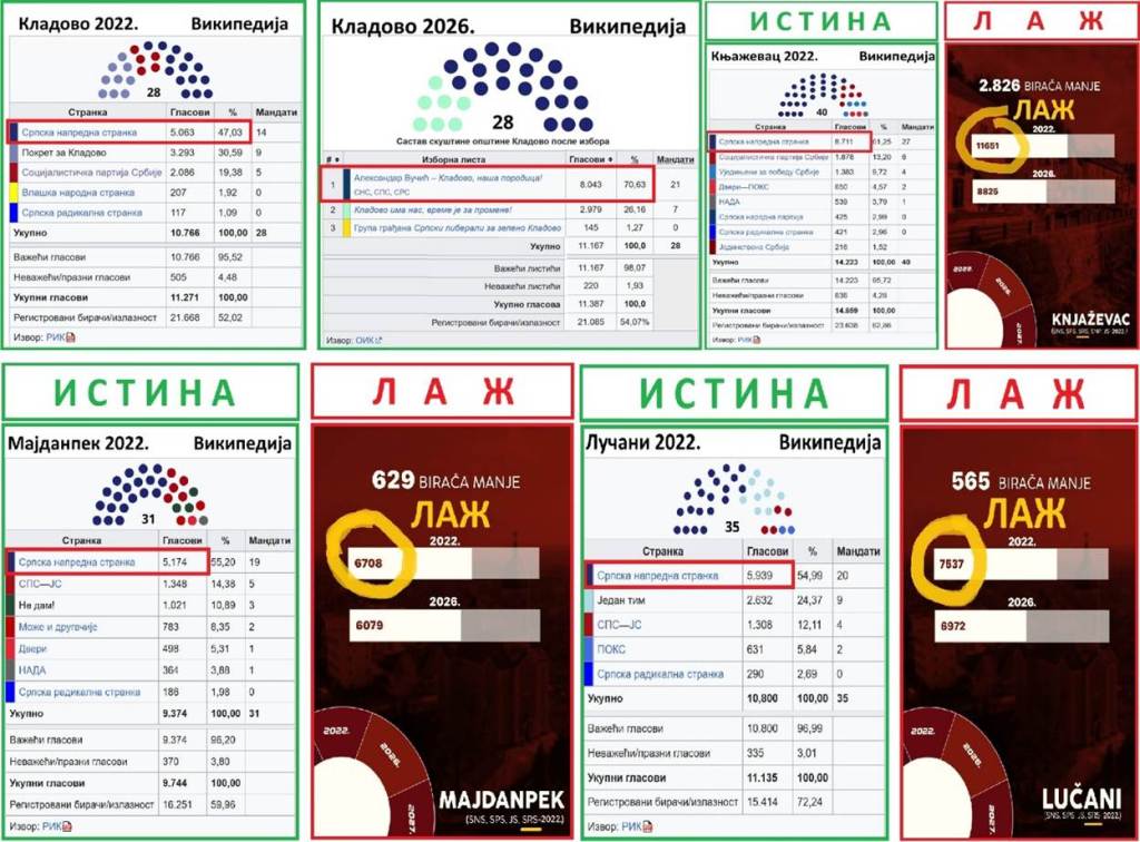 U tom obmanjujućem tekstu NoveS, punom glupih i očiglednih laži, stoji: „Studenti fakulteta tehničkih nauka objavili su koliko je SNS u broju glasova pao na tek održanim lokalnim izborima u 10 gradova i opština, u odnosu na izbore koji su održani 2022. godine. Tako je u Aranđelovcu Srpska napredna stranka 2022. godine osvojila 17.711 glasova, a 2026. je njen broj birača pao za 4.681 i sada iznosi 13.030. I u Smederevskoj Palanci je na ovim izborima vladajuća stranka osvojla 3. 621 glasova manje, jer je 2022. godine SNS imao 17.802 glasača, a sad ima 14.181. U Kuli (…) Kad se poredi sa izborima 2022. godine, vladajuća stranka izgubila 3.591 birača. Pala je sa 15.387 na 11.796 glasova. Veliki pad naprednjaci imaju i u Knjaževcu i Boru. Tako je u Knjaževcu 2022. godine SNS osvojio 11.651 glasova, a sada 8.825, što znači 2.826 birača manje. U Boru su u brojkama pali za 2.208, sa 14.724 pre četiri godine na 12.516 glasova, koliko su osvojili na tek završenim lokalnim izborima. U opštini Sevojno pad SNS iznosi 1.256, u Bajinoj Bašti su pali sa 10.154 na 8.950 glasova. U Majdanpeku su izgubili 629, a u Lučanima 565 glasova“.