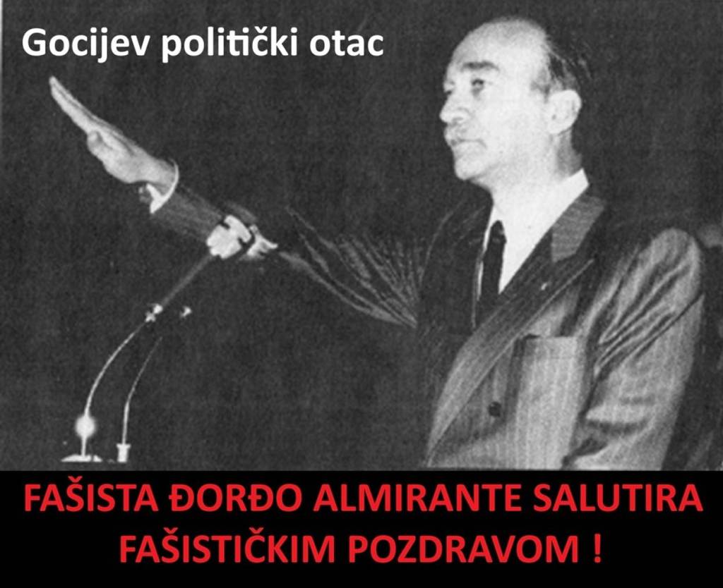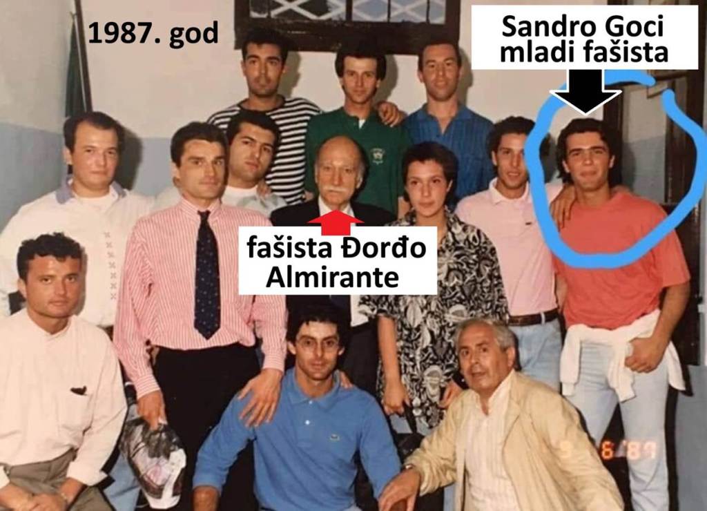 Goci panično krije da je bio član neofašističke stranke MSI (Movimento Sociale Italiano) od 1984. do 1992. godine – od svoje 16, pa do 24 godine života. Bio je član podmlatka te stranke, i ima fotografije sa fašistom Đorđom Almiranteom, osnivačem te neofašističke stranke. Ako neko ne veruje meni da vidimo šta kaže Vikipedija o italijanskoj stranci MSI? Na Vikipediji, stranica „Italian Social Movement“ stoji: „Italijanski socijalni pokret je bila neofašistička politička partija u Italiji. Stranka ekstremne desnice, se do devedesetih godina, predstavljala kao branilac italijanskog fašističkog nasleđa. Formirali su je 1946. simpatizeri bivšeg diktatora Benita Musolinija. MSI je ranih šezdesetih bila četvrta najjača partija u Italiji“ („The Italian Social Movement (Italian: Movimento Sociale Italiano, MSI) was a neo-fascist political party in Italy. A far-right party, it presented itself until the 1990s as the defender of Italian fascism’s legacy. Formed in 1946. by supporters of the former dictator Benito Mussolini. The MSI became the fourth largest party in Italy by the early 1960s“).