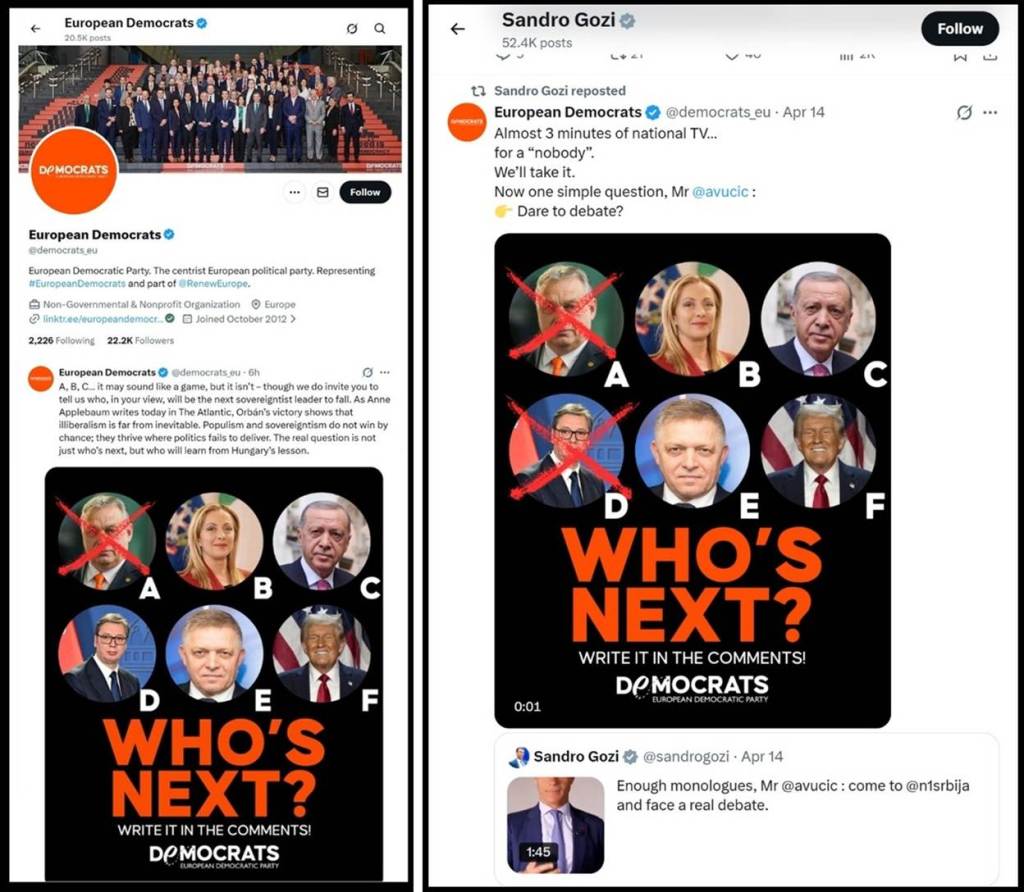 Preteća objava fašiste Sandra Gocija i „Evropskih demokrata“ se može shvatiti kao pretnja smrću, zbog toga što su na Vučića, Trampa i Fica izvršeni atentati, koje su njih trojica samo čudom preživeli. „Evropske demokrate“ su u Evropskom parlamentu deo vladajuće grupe „Obnovimo Evropu“ (Renew Europe). Zbog toga bi ovu pretnju morala da osudi Evropska komisija, Savet Evrope i Evropski parlament. Naravno, to se neće desiti. Rukavice su skinute. „Demokrate Evrope“ misle da je došlo njihovih pet minuta, i otvoreno prete liderima suverenistima, liderima slobodnog sveta. Demonokrate su krvožedne. Jednako ovako se ponašaju i opozicija i blokaderi u Srbiji. Oni Orbanov poraz prikazuju kao Vučićev poraz (!?!) i urliču – Vučiću ti si sledeći. Pri tome fašista Sandro Goci, poziva predsednika Vučića na TV duel na TVN1. TVN1 želi da ugosti fašistu Sandra Gocija, ne smeta im ružna fašistička prošlost fašiste Sandra Gocija, ali im smeta srpski predsednik Vučić, jedan od lidera slobodnog sveta!