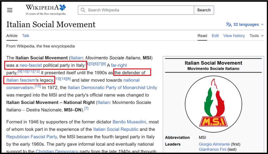 Na Vikipediji, stranica „Đorđo Almirante“ stoji: „Đorđo Almirante je bio italijanski političar koji je osnovao neofašističku stranku MSI, koju je predvodio do penzionisanja 1987. godine“ („Giorgio Almirante (27 June 1914. – 22 May 1988.) was an Italian politician who founded the neo-fascist Italian Social Movement, which he led until his retirement in 1987.“).