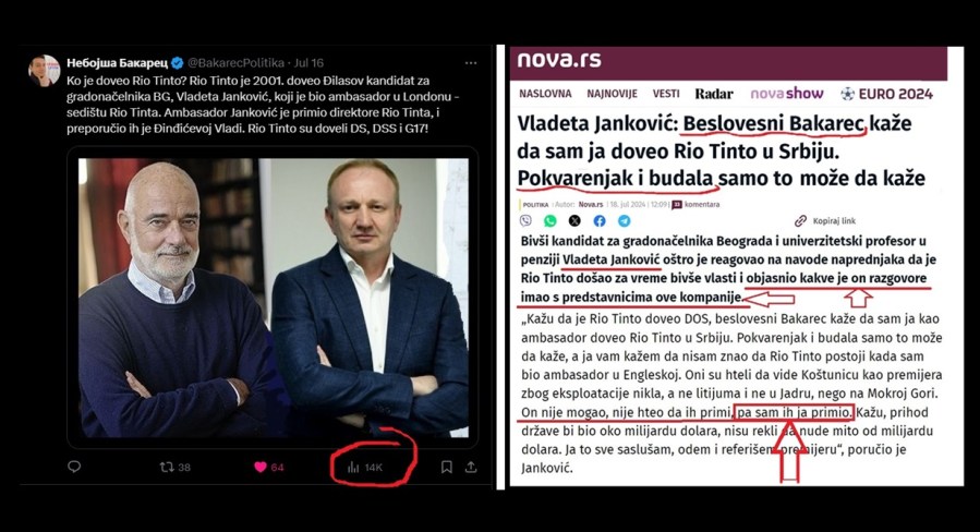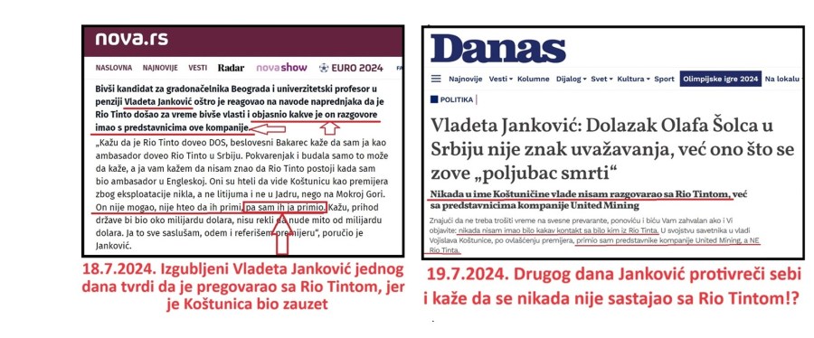 Đilas je u Šolakovim medijima dao veliki prostor svom propalom kandidatu za gradonačelnika Beograda, čoveku koji je doveo Rio Tinto – filologu Vladeti Jankoviću, koga je Đilas proglasio velikim stručnjakom za rudarstvo. Stoga imamo intervju Jankovića u listu Danas, i preneto na Nova i na N1. U tom sramnom intervjuu koji obiluje nesuvislostima, Janković lansira…