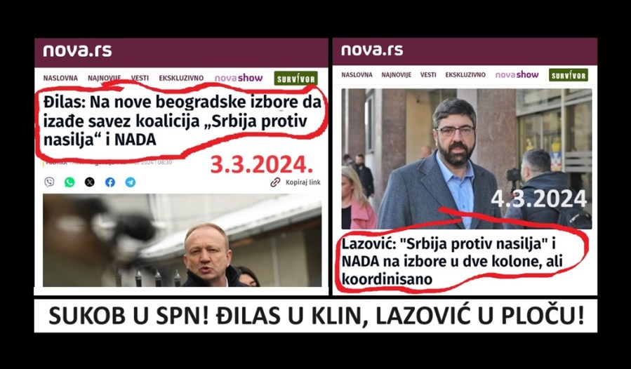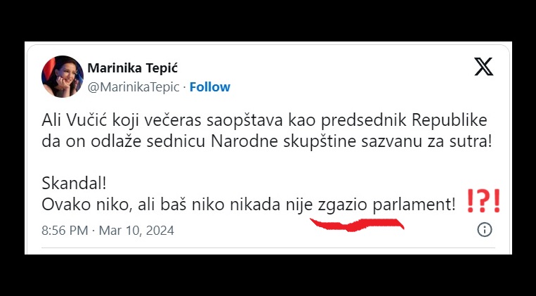 Grupa Đilasovih očajnika iz koalicije „Nasilje protiv Srbije“ se 11.3.2024. okupila u holu Skupštine Srbije, i opet zahtevala da im predsednik Vučić i SNS poklone vlast bez izbora. Nema leba bez motike, nema vlasti bez izbora! Opozicija traži "prelaznu vladu“, misleći da je izraz „prelazna vlada“ nastao od reči „preći nekoga“. Hoće da nas pređu!…