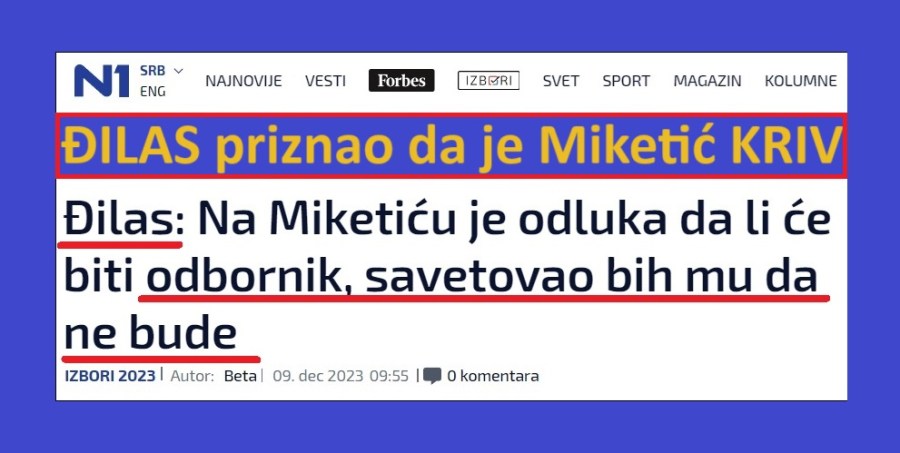 Odmah da udarim u glavu. Dragan Đilas vlasnik svih opozicionih stranaka izbacio je svog kandidata za gradonačelnika, Vladimira Obradovića iz gradonačelničke debate, koja treba da se održi u sredu, 13.12.ž2023. na TVN1. Umesto Vladimira Obradovića Đilas je na TVN1 u debatu kandidata za gradonačelnike poslao Milu Popović, koja nije kandidat za gradonačelnika! To se lepo…