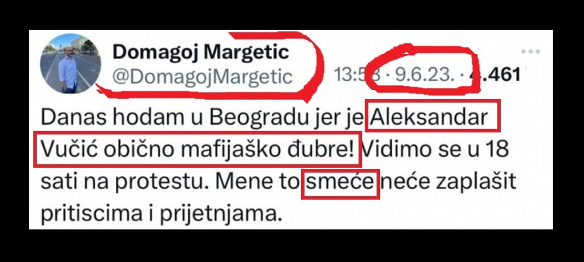 Protesti opozicije su deo namera „Kolektivnog zapada“, koji je odlučio da destabilizuje Srbiju, udarima iznutra i spolja, da bi izvršio pritisak na Srbiju u vezi Kosova i Metohije, i da bi naterao Srbiju da uvede sankcije Rusiji. Propali protesti su deo hibridnog rata protiv Srbije, jednako kao i teror fašiste Kurtija na KiM. Proevropska opozicija…
